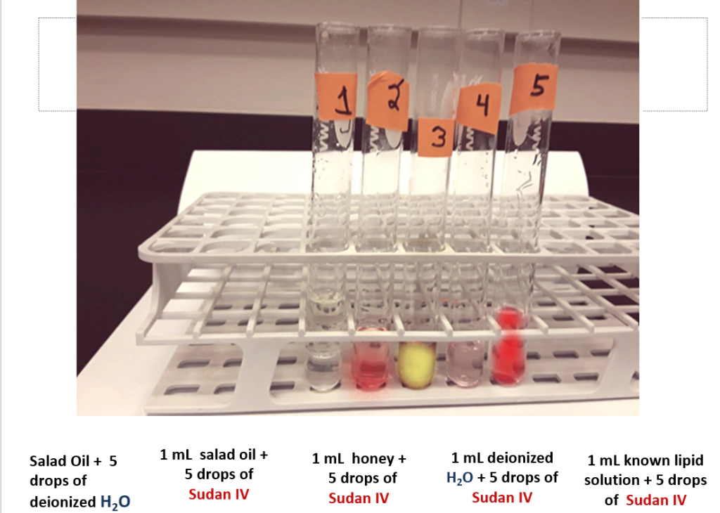 Resultado: una grasa o aceite se teñirá totalmente con Sudán III, mientras que, en el tubo con tinta, ésta se irá al fondo y el aceite no estará teñido, indicando la fase es acuosa, no lipídica.